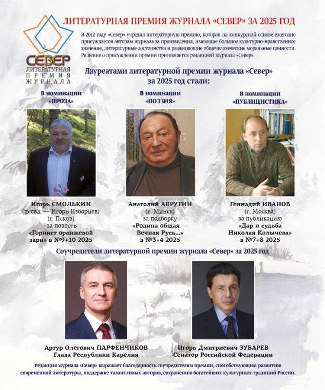 Лауреатами литературной премии журнала «Север» за 2025 год стали: