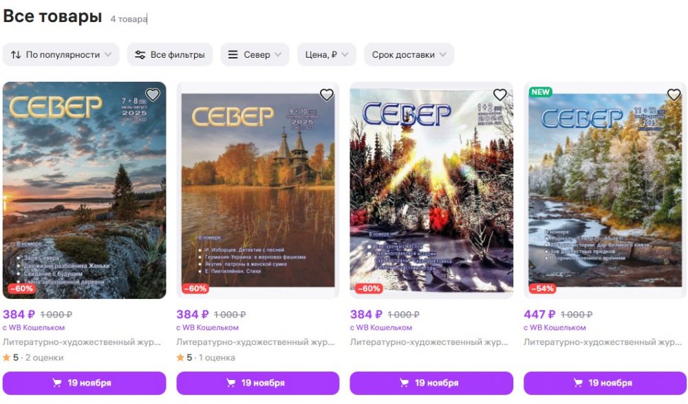 В начале 2025 года «Север» стал продаваться в российском интернет-магазине Wildberries. И вот небольшой итог. Едва-едва вышел в свет № 11-12 (ноябрь-декабрь), как все экземпляры, предназначенные для этой онлайн-платформы, были разобраны. Мы немного добавили журналов, но, похоже, начинает действовать принцип: кто не успел, тот опоздал.