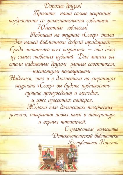 От имени коллектива редакции «Молодежной газеты Карелии» примите самые теплые поздравления с замечательным юбилеем - 70-летием Вашего журнала. От всей души желаем Вам творческих успехов, большой читательской аудитории, новых, интересных публикаций, талантливых авторов! Крепкого Вам здоровья, удачи, процветания!